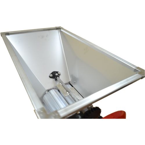 Принцип работы дробилки. Спускаясь по стенам емкости, виноградные гроздья попадают на валики где происходит их размельчение. Затем с помощью гребнеотделителя виноградная масса освобождается от стеблей и поступает в корзину с отверстиями, через которые протекает в установленный под машиной контейнер.